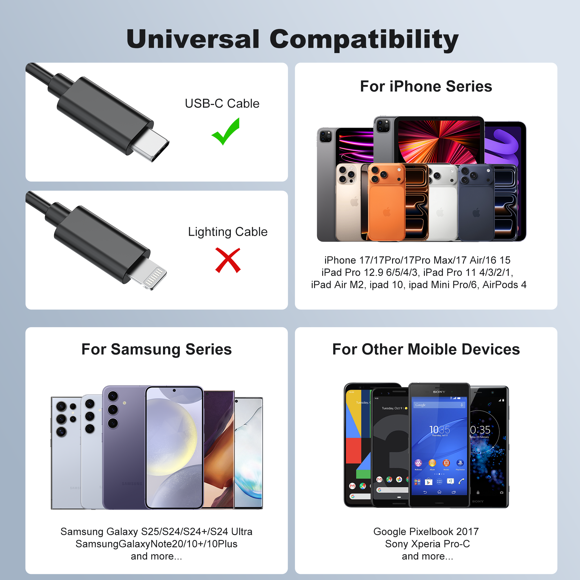Designed for the ecosystem you own. Fully compatible with major brands like Apple, Samsung, Google, and Sony, ensuring reliable charging and data transfer for your essential mobile devices and laptops.