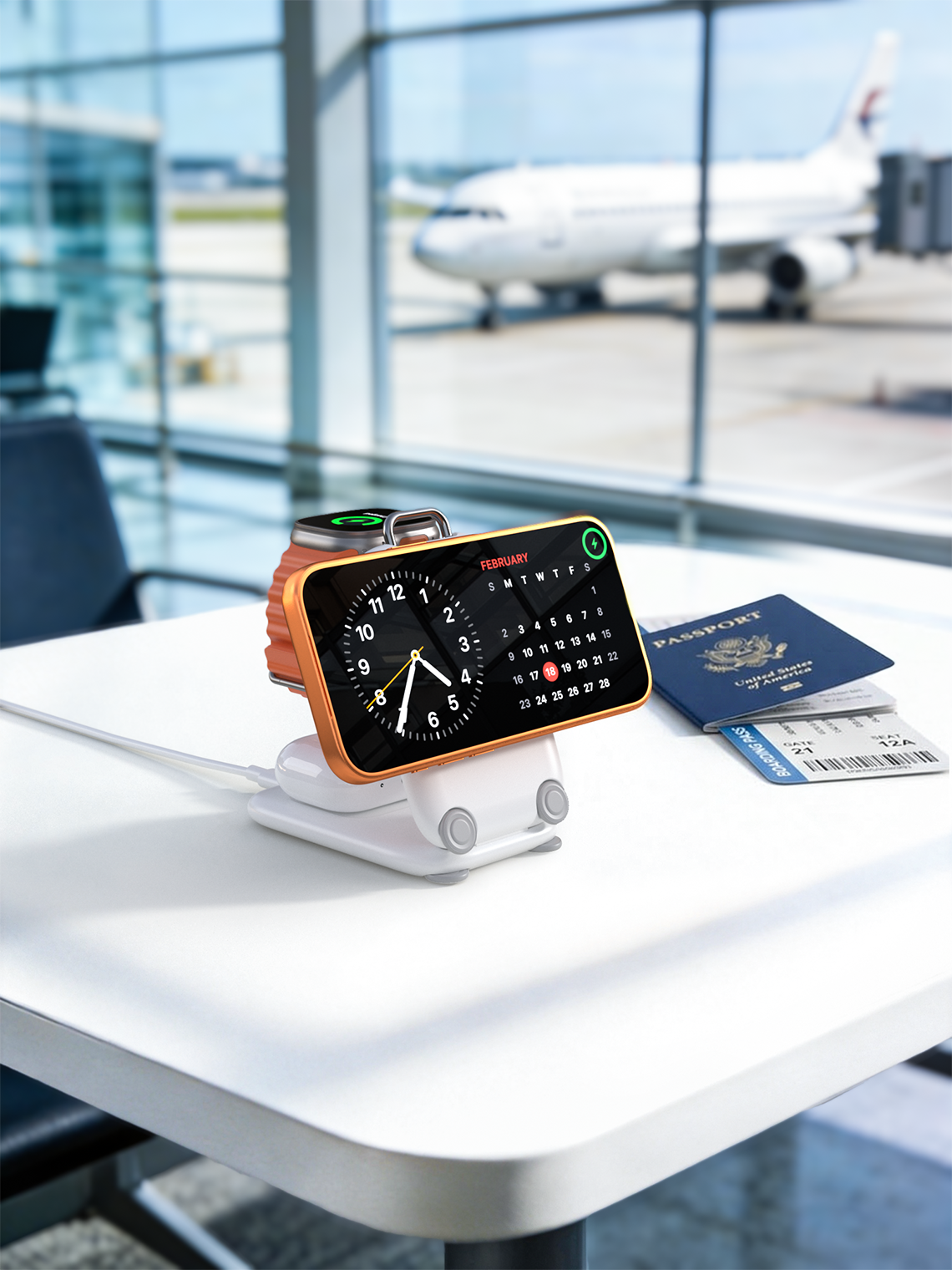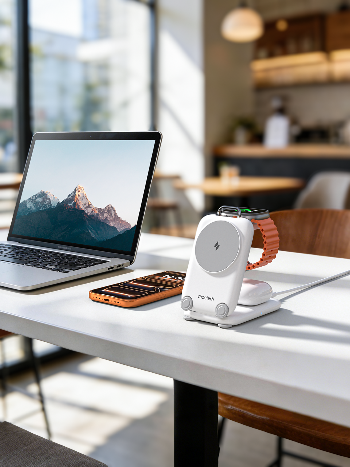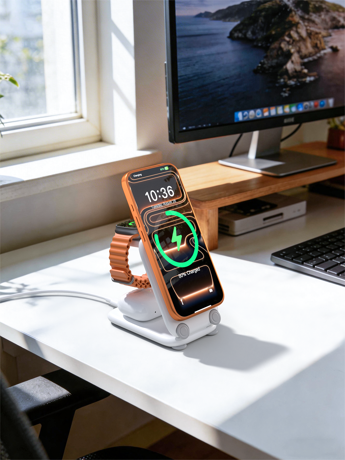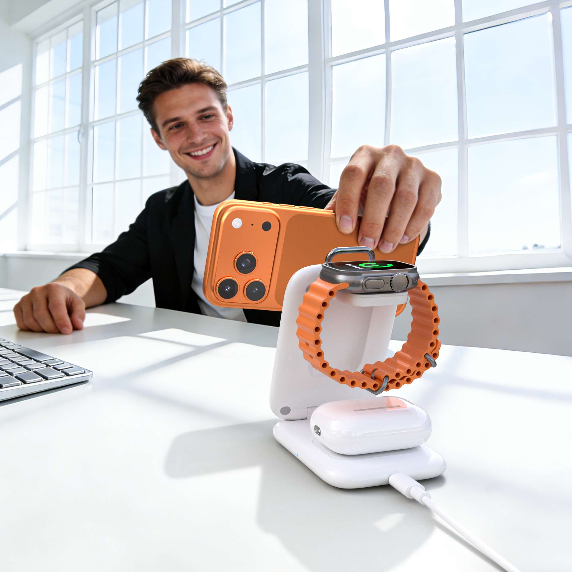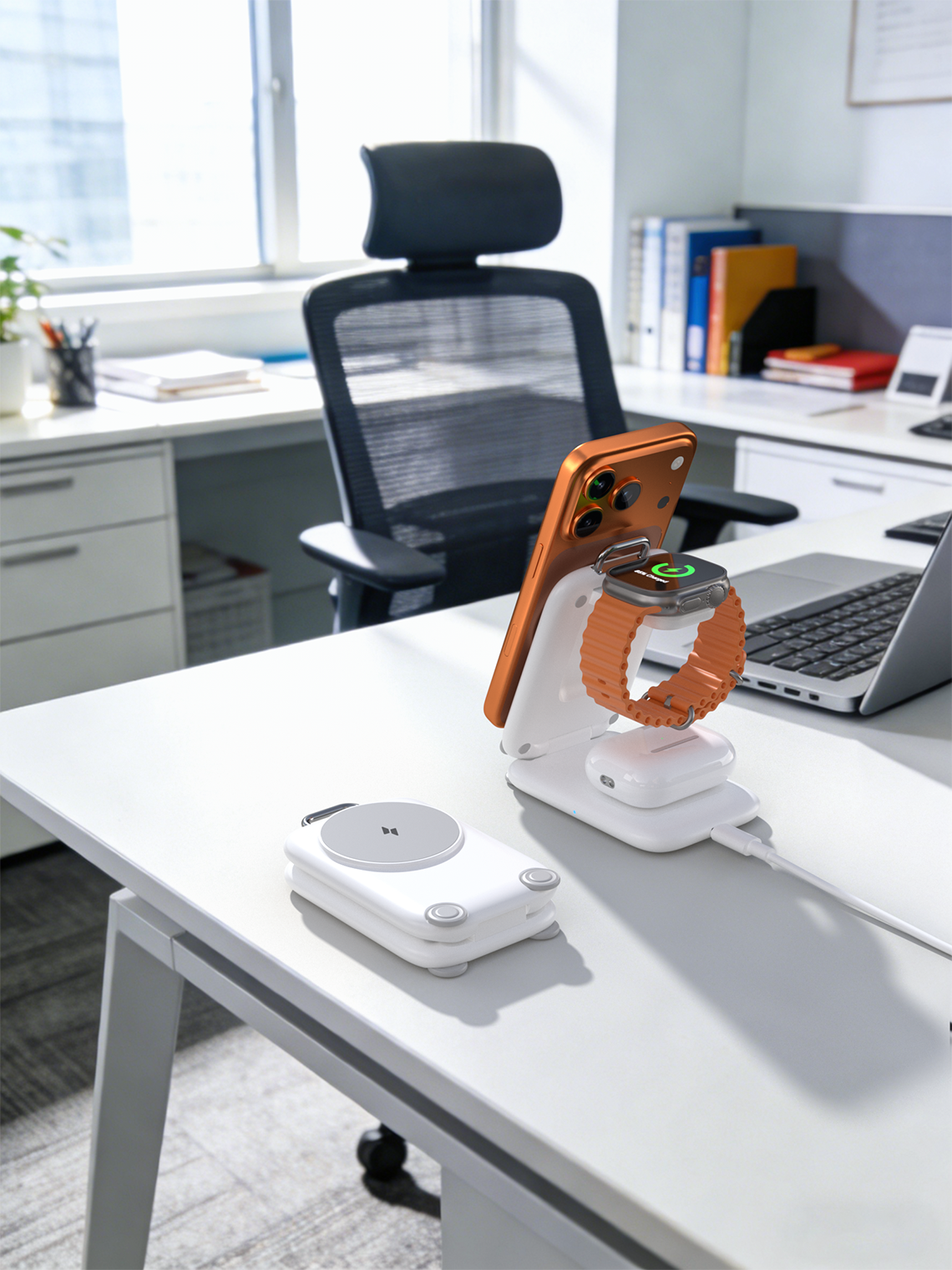 A compact 3-in-1 charging system designed to take up as little space as possible — in your bag, on your desk, and in your routine.