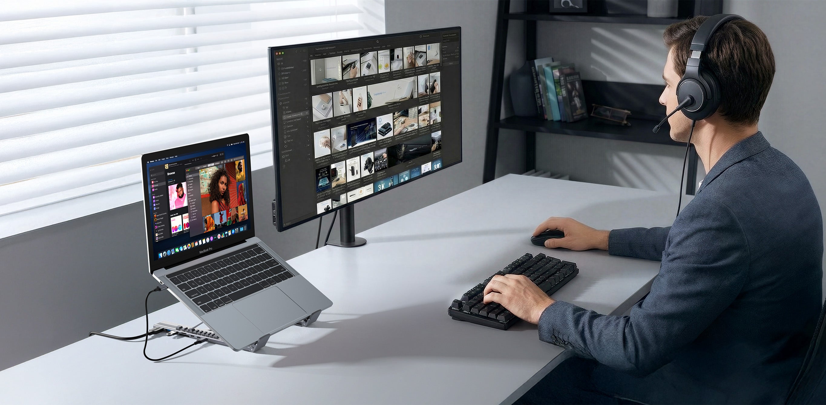 This setup supports external displays, full peripherals, and long work sessions — while keeping your workspace structured and distraction-free.