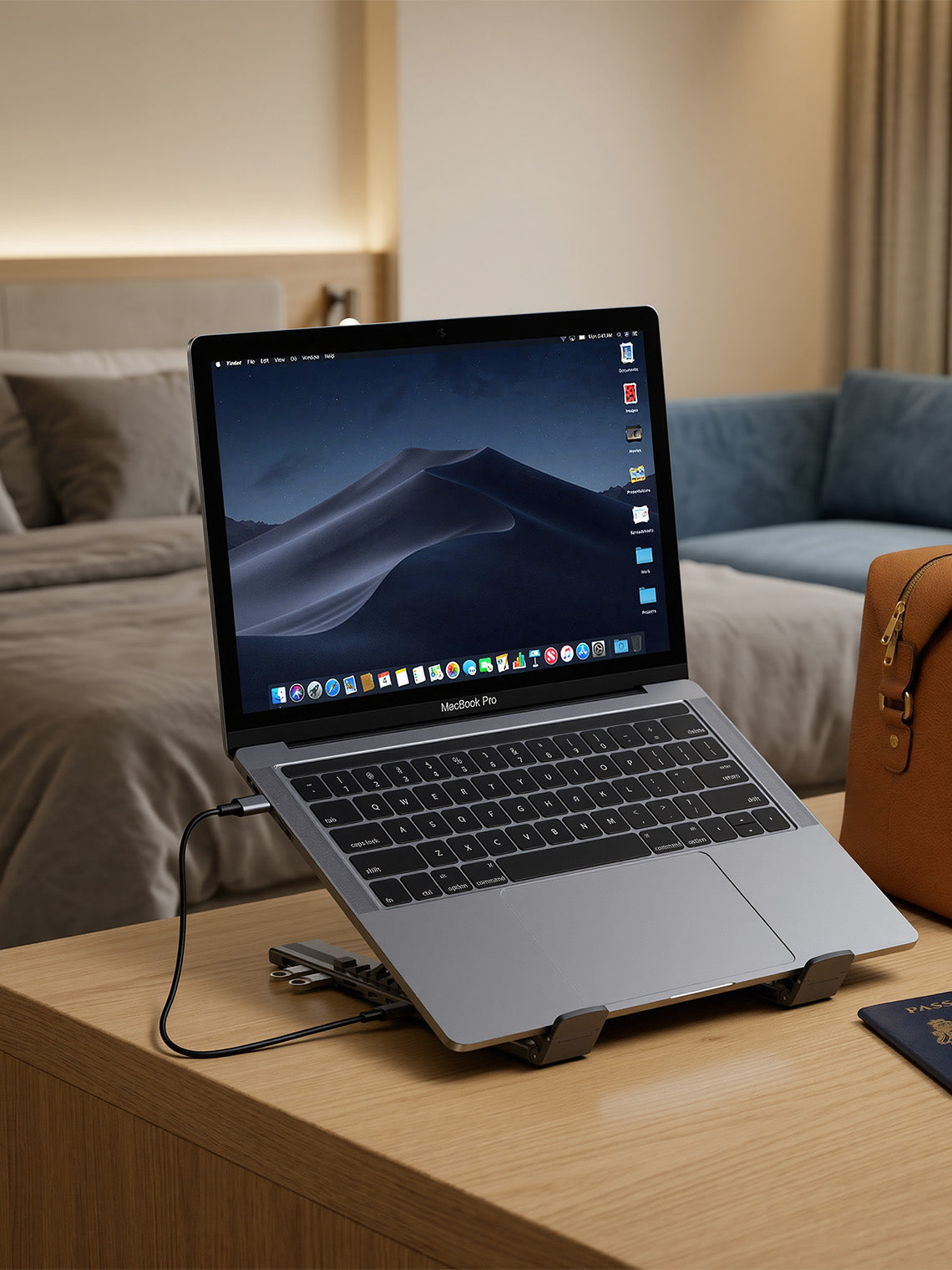 The same Laptop Dock Stand replaces both a stand and a hub, so you can work properly wherever you open your laptop.