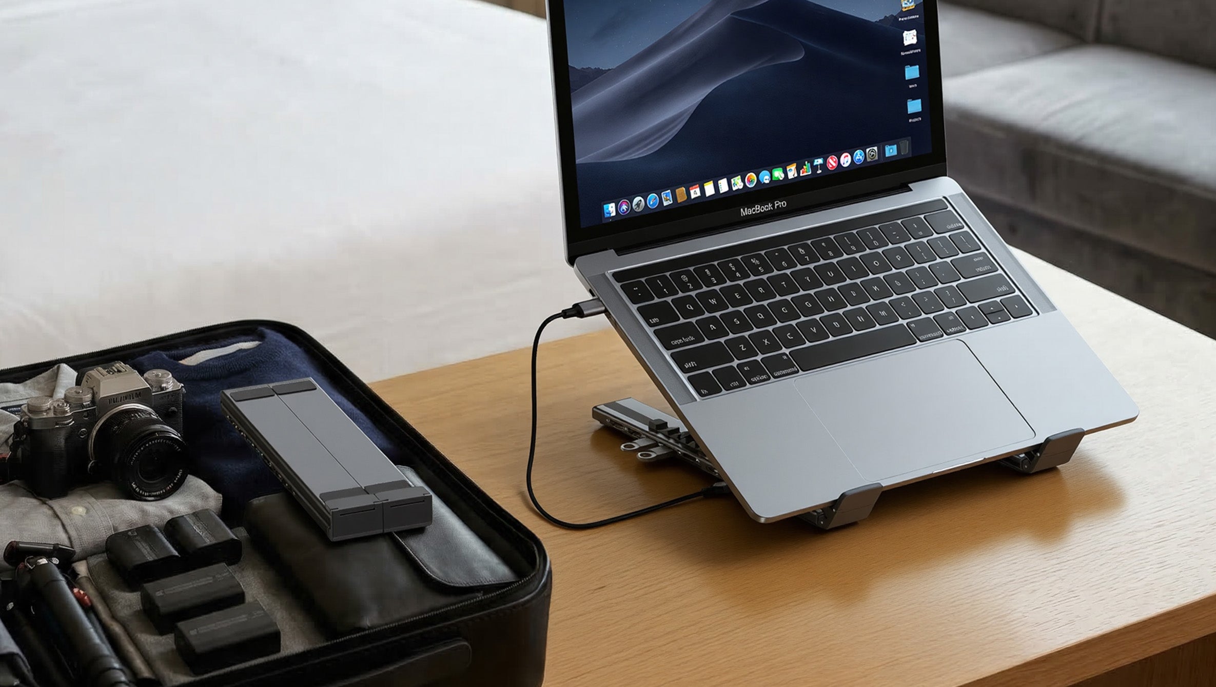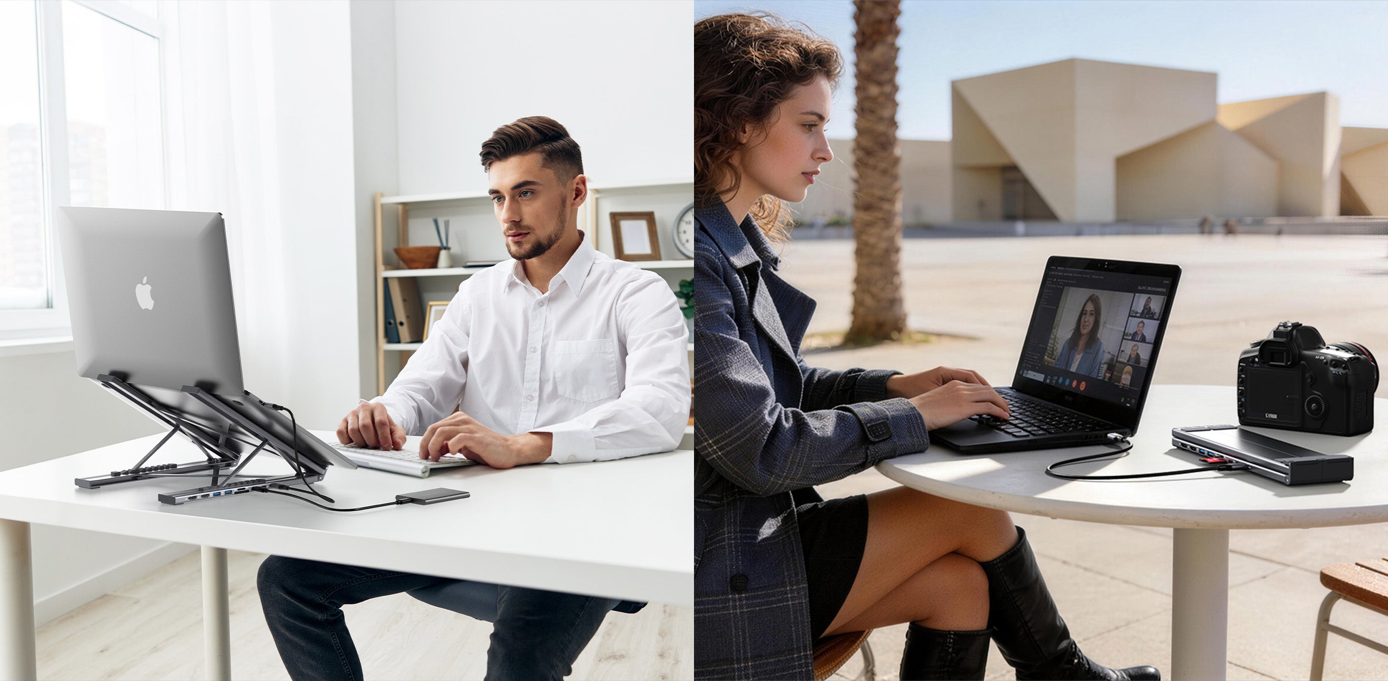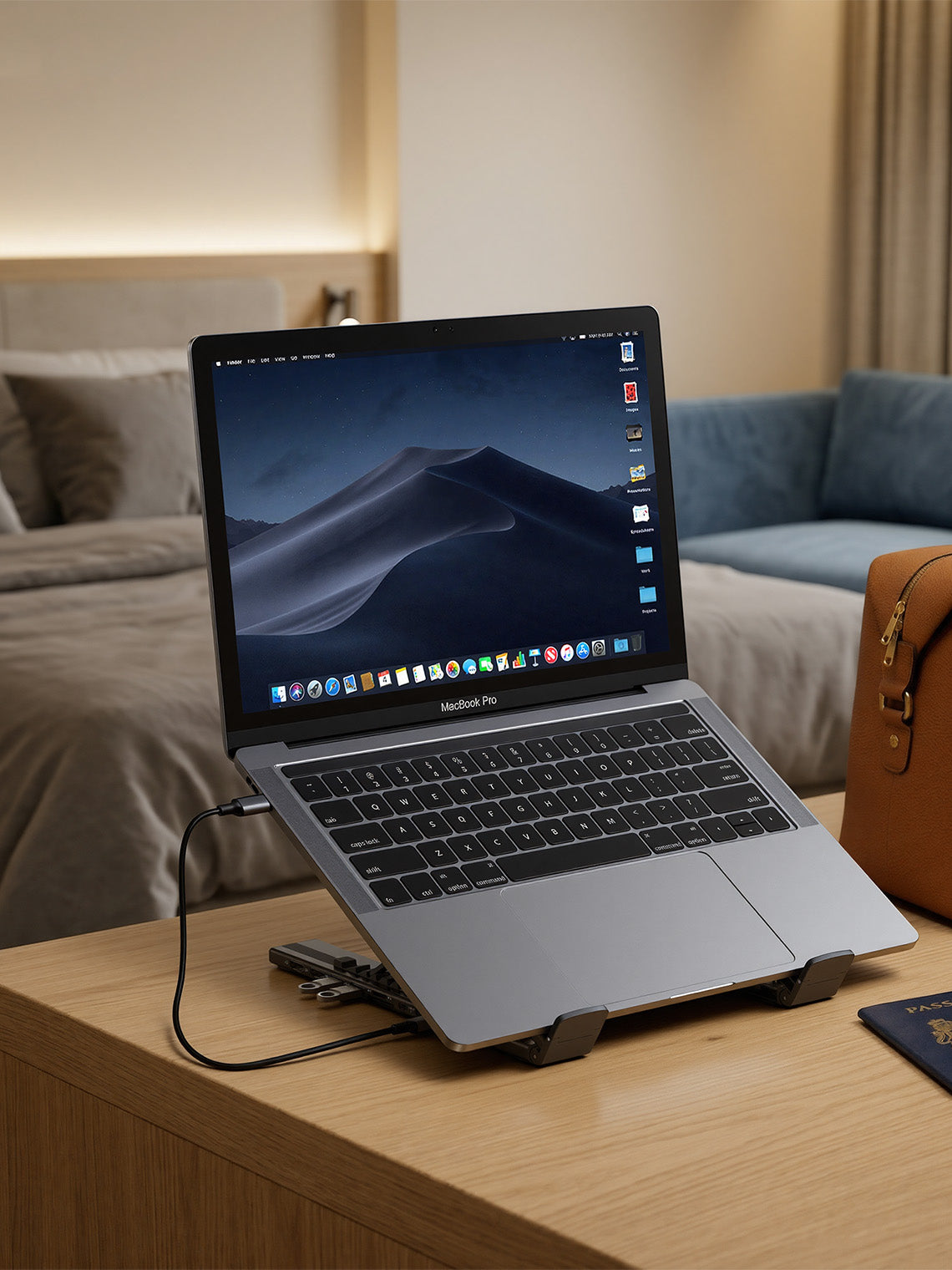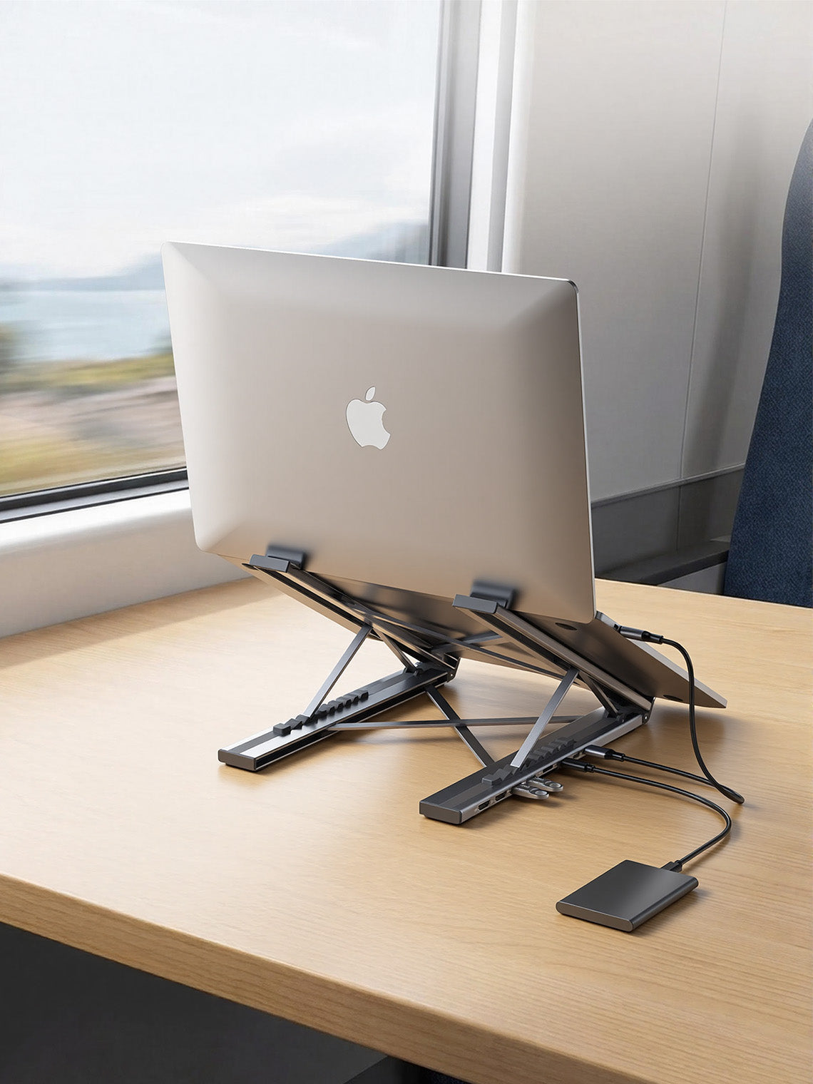 The same Laptop Dock Stand replaces both a stand and a hub, so you can work properly wherever you open your laptop.